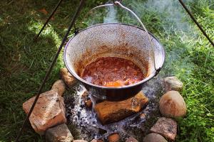 Egy kisebb bográcsban (lehet gázon is lábasban, de persze más lesz az íze) 10 dkg zsírban kiolvasztjuk a szalonna zsírját.
